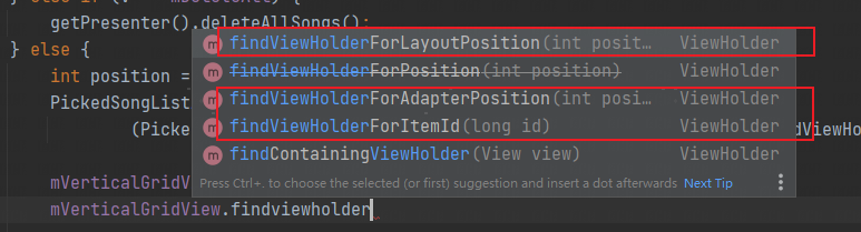 int position = mVerticalGridView.getSelectedPosition(); // 获取RV视图中被选中的项的位置索引。 PickedSongListAdapter.PickedSongViewHolder holder = (PickedSongListAdapter.PickedSongViewHolder) mVerticalGridView.findViewHolderForLayoutPosition(position); // 获取指定位置的 ViewHolder,用于操作该位置的视图元素。