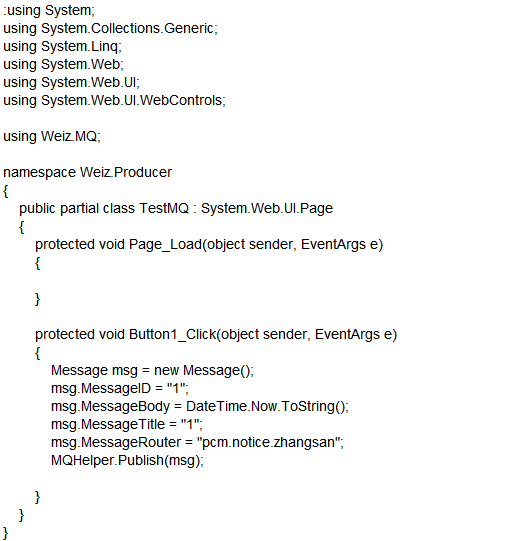 (2)启动Weiz. Producer 里的TestMQ.aspx 页面,往队列里面写一条消息。订阅的消费者立马就能拿到这条消息。