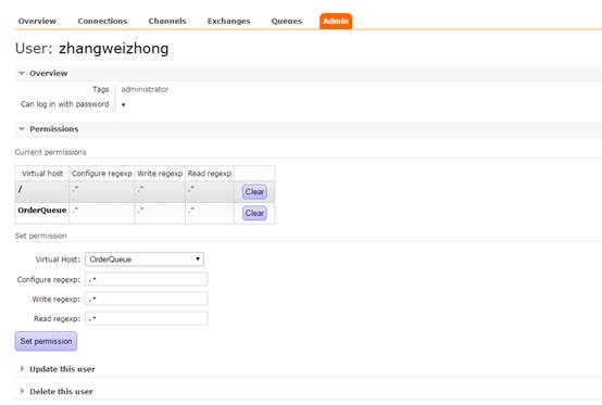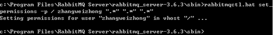 输入:rabbitmqctl.bat set_permissions -p / zhangweizhong ".*" ".*" ".*"