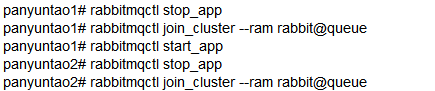 将panyuntao1、panyuntao2作为内存节点与queue连接起来,在panyuntao1上,执行如下命令: