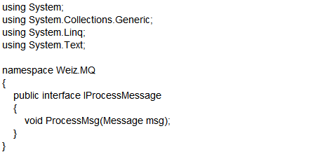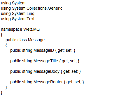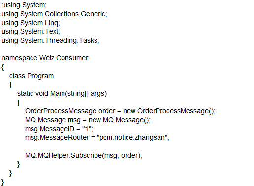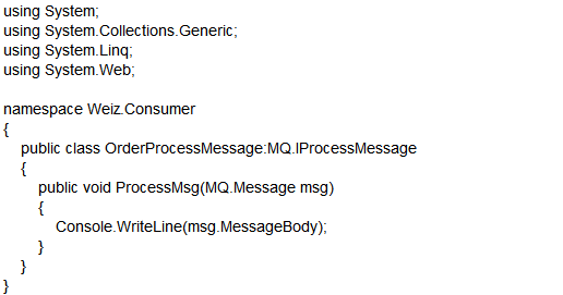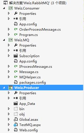 说明:前面我们提到过,RabbitMQ由Producer(生成者) 和Consumer(消费者)两部分组成。Weiz.Consumer就是Consumer(消费者),Weiz. Producer为Producer(生成者),Weiz.MQ为消息队列的通用处理类库。