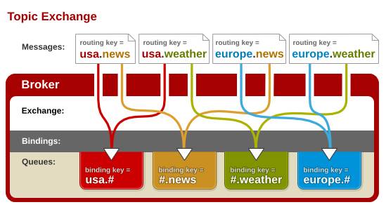 key和已经设置的binding,进行消息路由,将消息投递到一个或多个队列里。