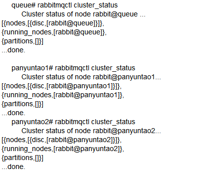 在queue、panyuntao1、panyuntao2上,运行cluster_status命令查看集群状态:
