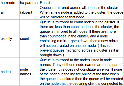 创建队列时需要指定ha 参数,如果不指定x-ha-prolicy 的话将无法复制。