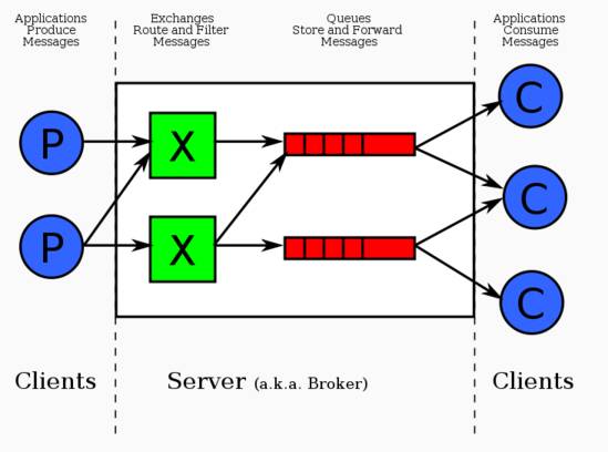 如上图所示:AMQP里主要说两个组件:Exchange和Queue。绿色的X就是Exchange ,红色的是Queue ,这两者都在Server端,又称作Broker,这部分是RabbitMQ实现的,而蓝色的则是客户端,通常有Producer和Consumer两种类型。