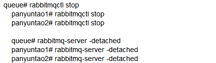 queue、panyuntao1、panyuntao2做为RabbitMQ集群节点,分别安装RabbitMq-Server ,安装后分别启动RabbitMq-server。
