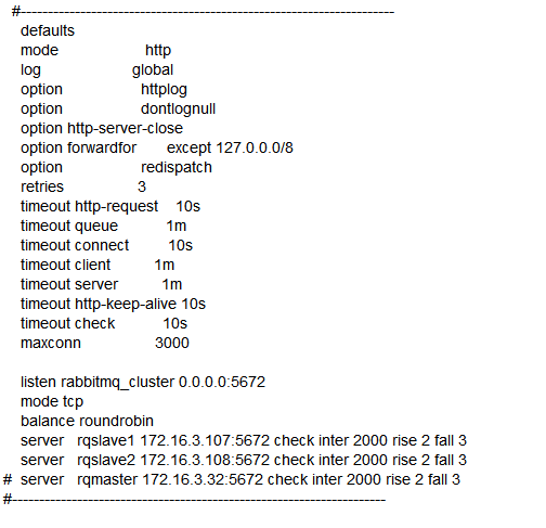 负载均衡器会监听5672端口,轮询我们的两个内存节点172.16.3.107、172.16.3.108的5672端口,172.16.3.32为磁盘节点,只做备份不提供给生产者、消费者使用,当然如果我们服务器资源充足情况也可以配置多个磁盘节点