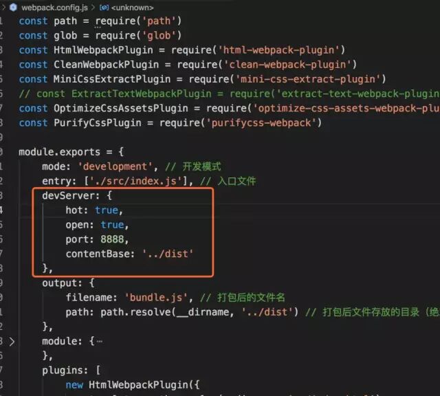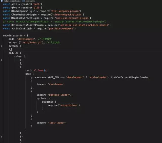 注意:在生产模式下,webpack自动将JS进行压缩。MiniCssExtractPlugin 推荐只用于生产环境,因为该插件在开发环境下会导致HMR功能缺失,所以日常开发中,还是用style-loader。2. 修改核心配置文件webpack.config.js