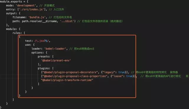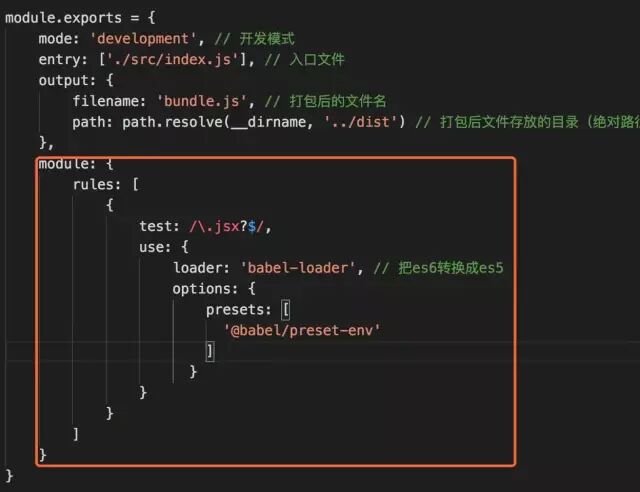 npm install babel-loader @babel/core @babel/preset-env -Dbabel-loader是将ES6等高级语法转换为能让浏览器能够解析的低级语法@babel/core是babel的核心模块,编译器。提供转换的API@babel/preset-env 可以根据配置的目标浏览器或者运行环境来自动将ES2015+的代码转换为es5
