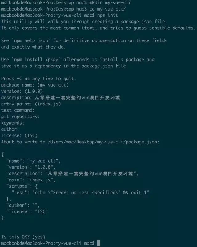 mkdir my-vue-cli 新建项目目录cd my-vue-cli/ 切换到项目目录npm init 生成项目的一些信息,最终会生成一个package.json文件。注意:可以输入npm init -y可以不用按回车