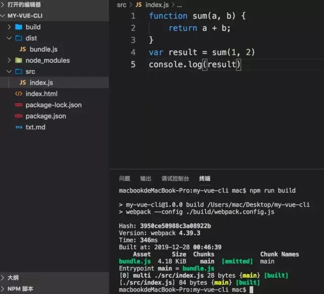 在index.js中添加测试代码验证webpack打包是否正确