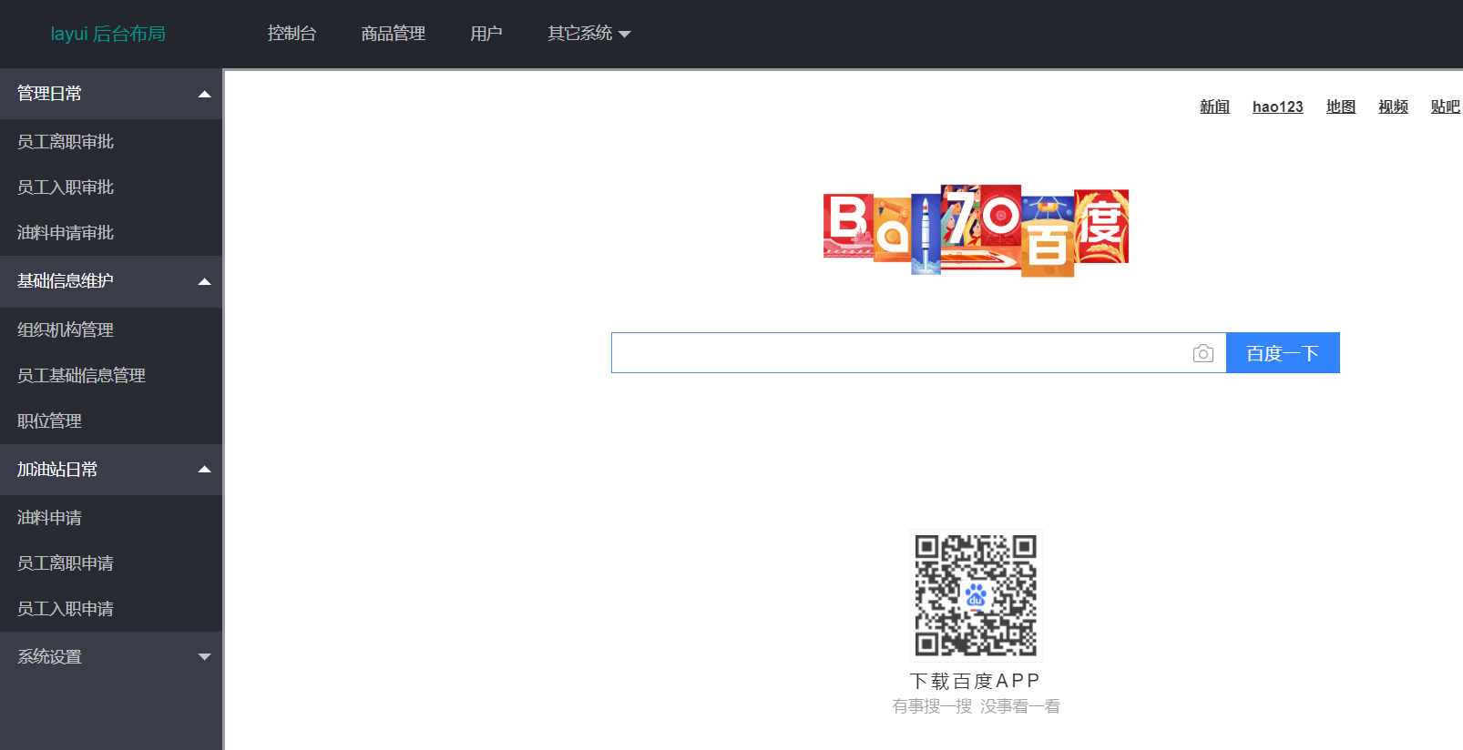 页面的内容还没有替换子页面,只是写了一个baidu链接,导航栏方面也使用了权限具体在后台限制