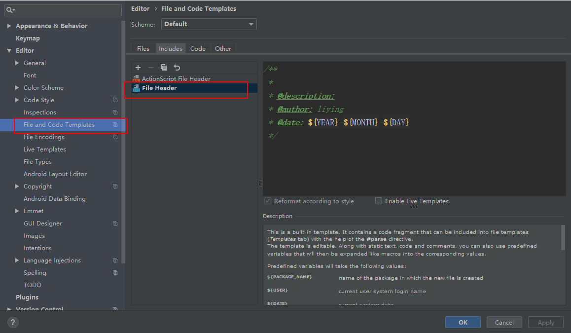 该配置应用于新建文件时,自动设置的文件头部注释格式。
