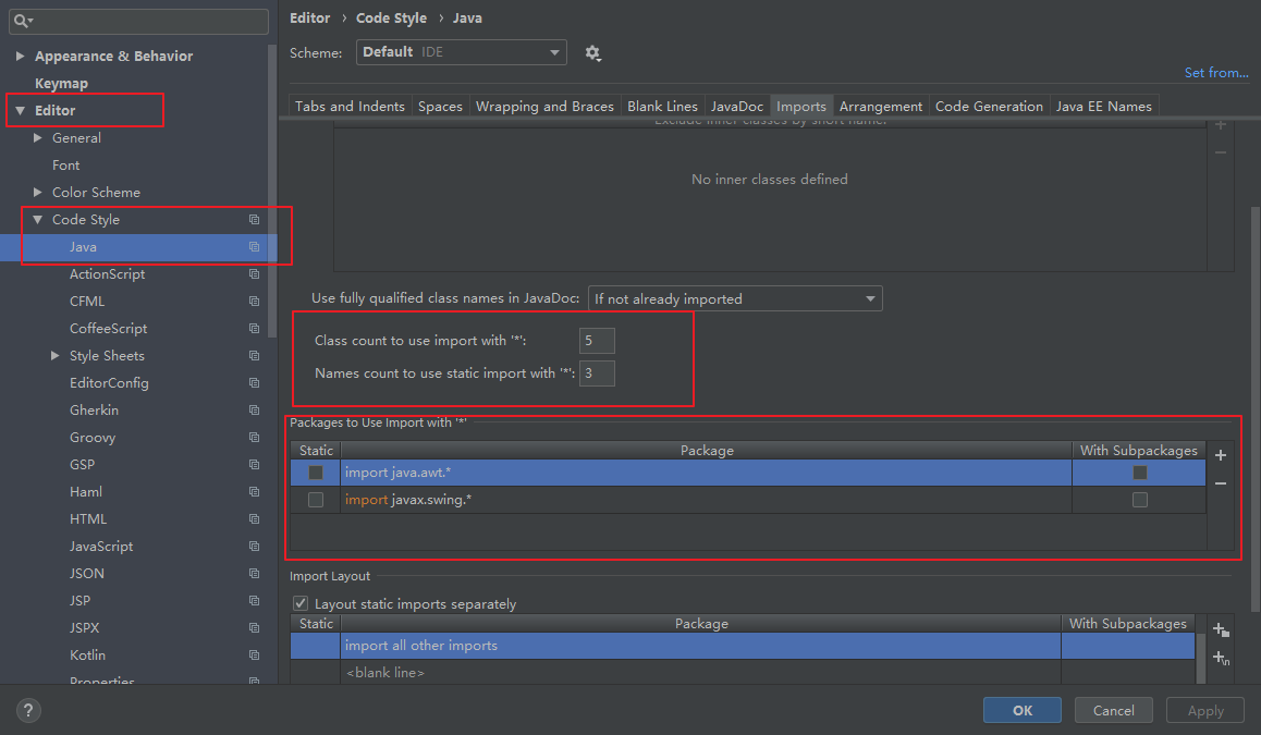 打开设置>Editor>Code Style>Java>Scheme Default>Imports