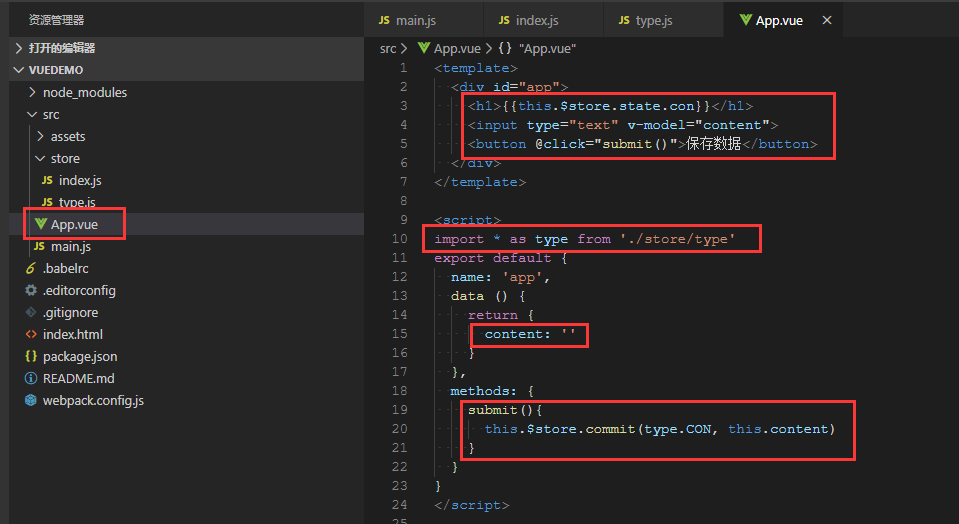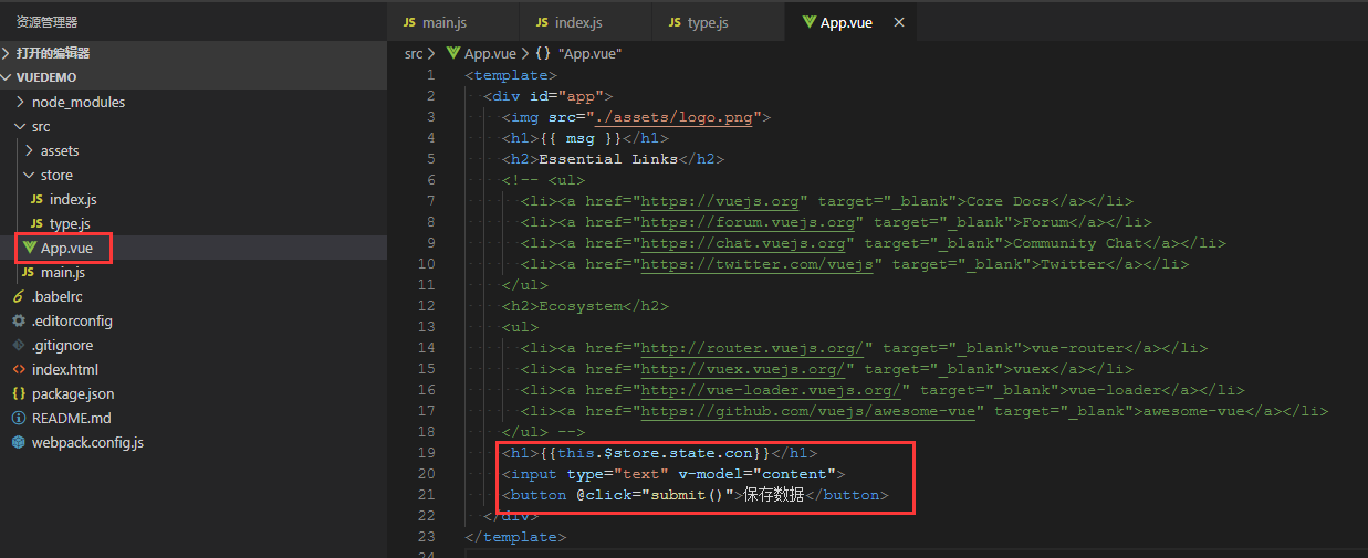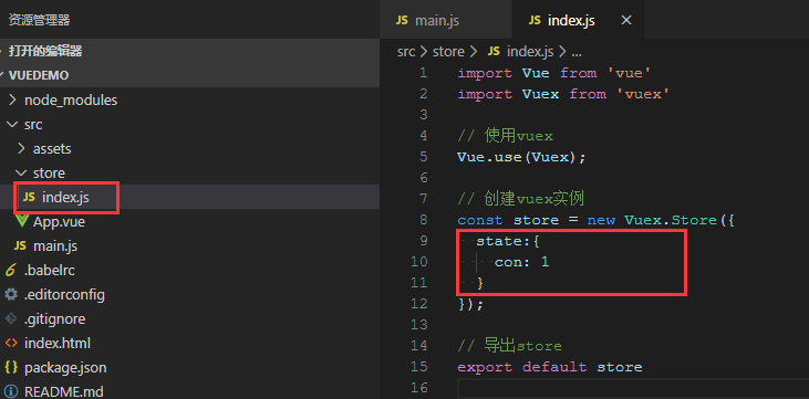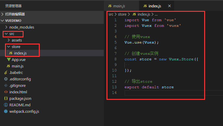 在项目中 src 文件里,新建文件夹 store ,并在 store 文件夹中 新建 index.js,在 index.js 中引入 vuex 和 vue,在创建Vuex.Store实例保存到变量store中,最后使用export default导出store