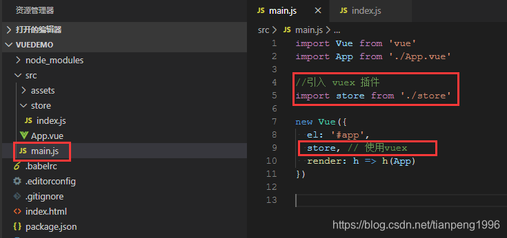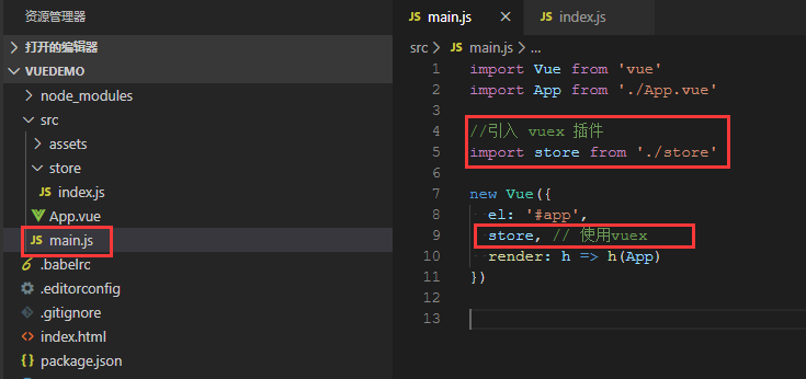 在 main.js 中,我们需要引入刚才文件,写入 import store from ‘./store’ 来引入,并且在vue实例全局引入store对象