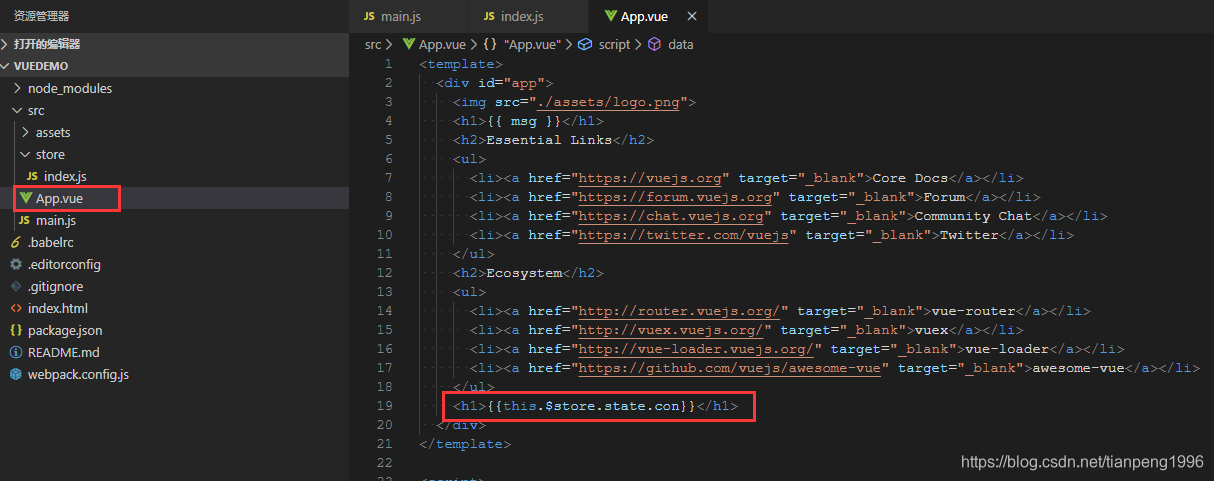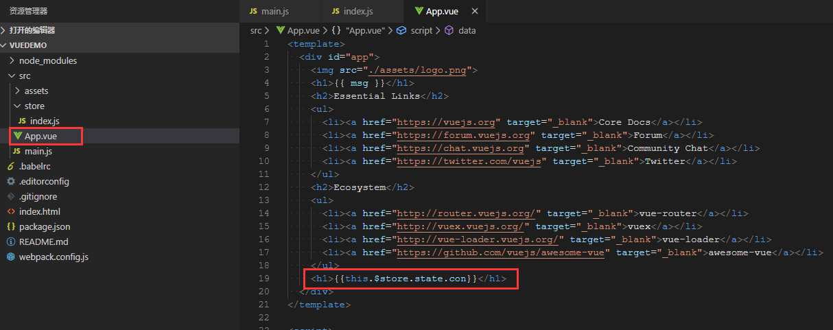 在我们刚才 index.js 中,创建的vuex实例中 定义数据,如下