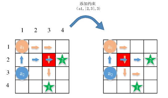 增强的基于冲突的搜索算法采用了聚焦搜索,在上下层搜索中加入了FOCAL列表,该算法基本思想为,从OPEN列表中选出允许误差的范围内的次优解放入FOCAL中,FOCAL中根据碰撞相关的参数进行排序,每次从FOCAL中选出碰撞数较小的节点进行扩展,这样每次进行扩展时,得出的结果都是碰撞数较少的,就能够更快找到次优解。