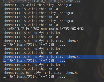 //等待方,等待条件满足做业务操作 public synchronized void waitSite() { while (CITY.equals(this.site)) { try { System.out.println("Thread:" + Thread.currentThread().getId() + " is wait! this city =" + this.site); wait(); System.out.println("Thread:" + Thread.currentThread().getId() + " is be noify! this city =" + this.site); } catch (InterruptedException e) { e.printStackTrace(); } } System.out.println("满足条件!wait结束!执行业务操作......"); } // 通知方:变化地点,然后通知处于wait状态并需要处理地点的线程进行业务处理 public synchronized void changeSite() { this.site = "shenzhen"; System.out.println("site条件改变!通知线程 name:"+Thread.currentThread().getName()+",做唤醒线程操作!"); notifyAll(); } //main函数做的操作 public static void main(String[] args) throws InterruptedException { for (int i = 0; i < 3; i++) { //三个线程监控快递地点变化 new waitSiteThread().start(); //三个线程监控快递距离变化 new waitKmThread().start(); } Thread.sleep(1000); express.changeSite(); }