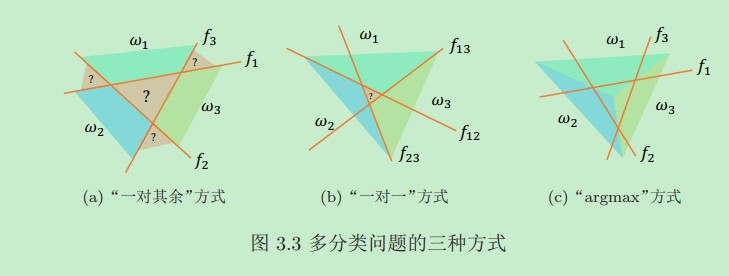 - “argmax”方式:一种改进的一对其余的方式,共需要C个判别函数,如果对于类别c, 对于其他的类别满足fc(x;wc)>f(not c)(x;w(not c)),那么该类属于c类