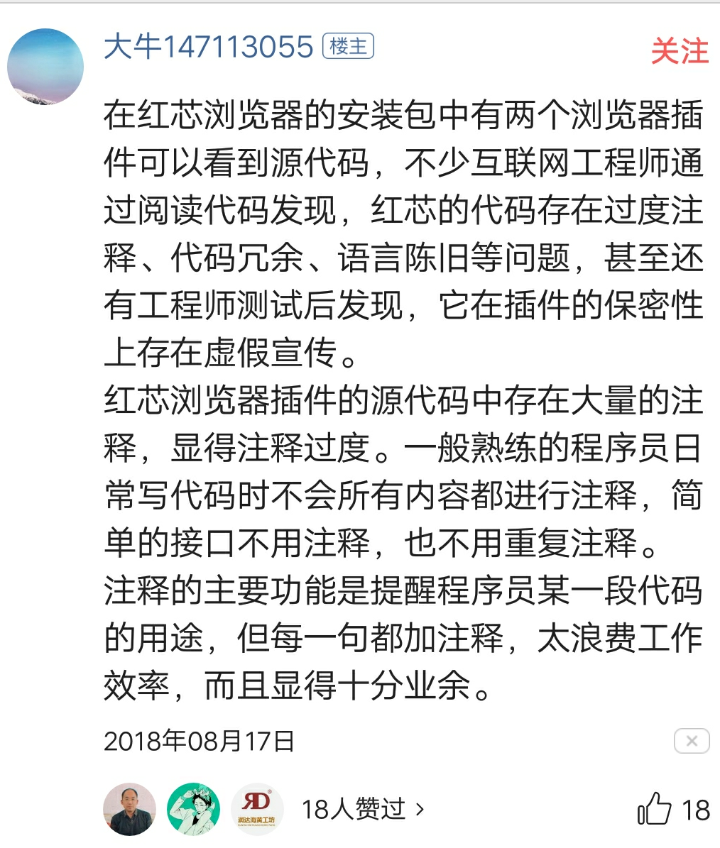 红芯宣布完成了2.5亿元C轮系列融资,并对外宣称其在通用的浏览器架构的基础上,结合了红芯自主创新的技术,改造成新一代安全浏览器内核。然而在8月16号有媒体曝光,红芯浏览器实际上只是把chrome浏览器换了个壳,也并未像其宣传的那么安全。这件事情引起了不少程序员的吐槽,并且说红芯时代所称的三点创新完全是在混淆视听。
