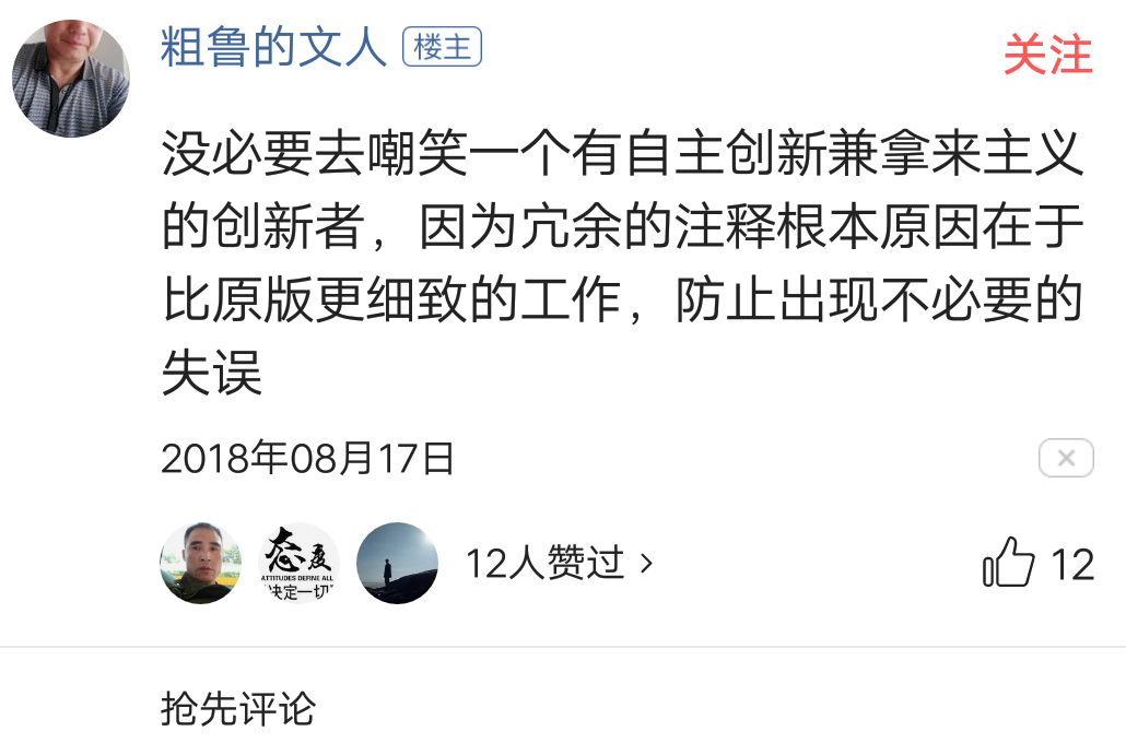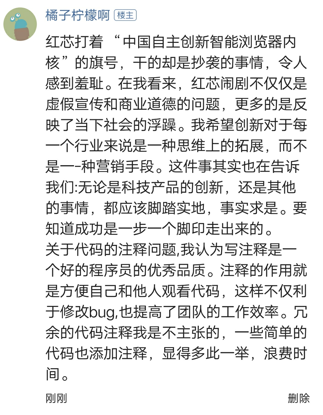 4、反对。虽说创新的最终结果不一定是新事物,但红芯这种照搬全套的行为绝不是一个创造者该有的。较为简单,容易被程序员一眼看出的代码,再添加注释,实在是多此一举。