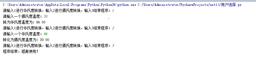 1 while True: 2 a = input("请输入1进行华氏度转换,输入2进行摄氏度转换,输入3结束程序:") 3 if a == "1": 4 temp = float(input("请输入一个摄氏度温度:")) 5 tran = temp*9/5+32 6 print("转为华氏度温度为:{:.2f}".format(tran)) 7 elif a == "2": 8 temp = float(input("请输入一个华氏度温度:")) 9 tran = 5*(temp-32)/9 10 print("转化为摄氏度温度为:{:.2f}".format(tran)) 11 else: 12 print("程序结束,感谢使用!") 13 break