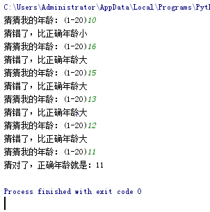 import random def 猜年龄(): answer = random.randint(1,21) num = int(input("猜猜我的年龄:(1-20)")) while answer != num: if answer > num: print("猜错了,比正确年龄小") num = int(input("猜猜我的年龄:(1-20)")) if answer < num: print("猜错了,比正确年龄大") num = int(input("猜猜我的年龄:(1-20)")) print("猜对了,正确年龄就是:" + str(answer)) if __name__ == "__main__": 猜年龄()