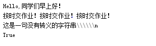 str1 = "Hello,同学们早上好!" str2 = "按时交作业!" print(str1 + "\n" + str2*3) print(r"这是一句没有转义的字符串\\\\\\n") print('H' in str1)