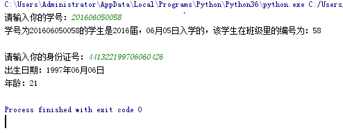 def 解析学号(): stu_num = input("请输入你的学号:") 届 = stu_num[0:4] 入学月 = stu_num[4:6] 入学日 = stu_num[6:8] 班级编号 = stu_num[10:12] print("学号为{0}的学生是{1}届,{2}月{3}日入学的,该学生在班级里的编号为:{4}".format(stu_num, 届, 入学月, 入学日, 班级编号)) def 解析身份证(): per_id = str(input("请输入你的身份证号:")) 出生年份 = per_id[6:10] 月份 = per_id[10:12] 日 = per_id[12:14] 年龄 = 2018-int(per_id[6:10]) print("出生日期:{0}年{1}月{2}日\n年龄:{3}".format(出生年份, 月份, 日, 年龄)) if __name__ == "__main__": 解析学号() 解析身份证()
