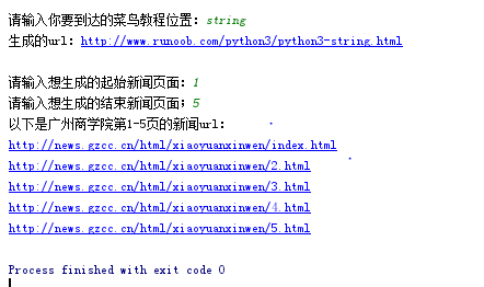 def 生成菜鸟教程url(): print() 位置 = input("请输入你要到达的菜鸟教程位置:") url = "http://www.runoob.com/python3/python3-" + 位置 + ".html" print("生成的url:" + url) def 生成广商新闻url(): print() start = int(input("请输入想生成的起始新闻页面:")) end = int(input("请输入想生成的结束新闻页面;")) print("以下是广州商学院第{0}-{1}页的新闻url:".format(start,end)) # print(list("http://news.gzcc.cn/html/xiaoyuanxinwen/"+ i +".html" for i in range(start,end+1))) for i in range(start,end+1): if i == 1: print("http://news.gzcc.cn/html/xiaoyuanxinwen/index.html") else: print("http://news.gzcc.cn/html/xiaoyuanxinwen/{}.html".format(i)) if __name__ == "__main__": 生成菜鸟教程url() 生成广商新闻url()