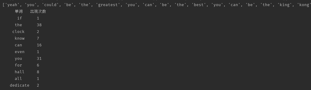 1 歌词 = """ 2 Yeah, you could be the greatest, you can be the best 3 是的,你可以成为最伟大的,你可以成为最好的 4 You can be the King Kong banging on your chest 5 你可以成为敲打着胸膛的金刚 6 You could beat the world, you could beat the war 7 你可以打败世界,你可以打败战争 8 You could talk to God, go banging on His door 9 你可以与上帝交谈,敲打他的大门 10 11 You can throw your hands up, you can beat the clock 12 你可以举起双手,你可以赶上时间 13 You can move a mountain, you can break rocks 14 你可以移动山峰,你可以击碎岩石 15 You could be a master, don't wait for luck 16 你可以成为主人,不需要等待幸运降临 17 Dedicate yourself and you can find yourself 18 奉献你自己,然后你便可以找到自我 19 20 Standing in the hall of fame 21 站在名人堂中 22 And the world's gonna know your name 23 全世界都会知道你的名字 24 Cause you're burning with the brightest flame 25 因为你为最明亮的火焰所燃 26 And the world's gonna know your name 27 全世界都会知道你的名字 28 And you'll be on the walls of the hall of fame 29 而你会位列名人堂之墙 30 31 You could go the distance, you can run the mile 32 你可以坚持到底,你可以跑到极限 33 You can walk straight through hell with a smile 34 你可以微笑着穿越地狱 35 You could be the hero, you could get the gold 36 你可以成为英雄,你可以获得金牌 37 Breaking all the records they thought never could be broke 38 打破所有那些别人认为牢不可破的记录 39 40 Do it for your people, do it for your pride 41 行动吧,为你的人民,为你的骄傲 42 Never gonna know if you never even try 43 如果不尝试就永远不会知道结果 44 Do it for your country, do it for you name 45 行动吧,为你的国家,为你的名誉 46 Cause there gonna be a day 47 因为将会有一天 48 49 When you're standing in the hall of fame 50 当你站在名人堂中 51 And the world's gonna know your name 52 全世界都会知道你的名字 53 Cause you're burning with the brightest flame、 54 因为你为最明亮的火焰所燃 55 And the world's gonna know your name 56 而全世界都会知道你的名字 57 And you'll be on the walls of the hall of fame 58 你会位列名人堂之墙 59 60 Be a champion, 61 成为冠军 62 Be a champion, 63 成为冠军 64 Be a champion, 65 成为冠军 66 Be a champion 67 成为冠军 68 On the walls of the hall of fame 69 在名人堂之墙上 70 71 Be students 72 成为学生 73 Be teachers 74 成为导师 75 Be politicians 76 成为政客 77 Be preachers 78 成为传教士 79 80 Be believers 81 成为信徒 82 Be leaders 83 成为领导者 84 Be astronauts 85 成为航天员 86 Be champions 87 成为冠军 88 Be truth seekers 89 成为真理的探索者 90 91 Be students 92 Be teachers 93 Be politicians 94 Be preachers 95 96 Be believers 97 Be leaders 98 Be astronauts 99 Be champions 100 101 Standing in the hall of fame 102 And the world's gonna know your name 103 Cause you're burning with the brightest flame 104 And the world's gonna know your name 105 And you'll be on the walls of the hall of fame 106 107 You could be the greatest, you can be the best 108 You can be the King Kong banging on your chest 109 You could beat the world, you could beat the war 110 You could talk to God, go banging on his door 111 112 You can throw your hands up, you can beat the clock 113 You can move a mountain, you can break rocks 114 You could be a master, don't wait for luck 115 Dedicate yourself and you can find yourself 116 117 Standing in the hall of fame 118 """ 119 120 歌词 = 歌词.split("\n") 121 # 删除空格 122 歌词 = list(x for x in 歌词 if x != "") 123 124 # 中英文分词 125 index1 = 歌词.index("成为真理的探索者") 126 英文部分 = [] 127 for index2 in range(0, index1+1): 128 if index2 % 2 == 0: # 英文行 129 英文部分.append(歌词[index2]) 130 131 英文部分 += 歌词[index1+1::] 132 133 # 拆分成单词 134 英文分词 = [] 135 # 先按逗号拆,再按空格拆 136 for i in 英文部分: 137 i = i.split(",") 138 for j in i: 139 英文分词.extend(j.split(" ")) 140 141 # 去空格 142 英文分词 = list(i.lower() for i in 英文分词 if i != "") 143 144 print(英文分词) 145 146 # 用字典,统计单词个数 147 set1 = set(英文分词) 148 KeyList = [] 149 ValueList = [] 150 151 for key in set1: 152 KeyList.append(key) 153 ValueList.append(英文分词.count(key)) 154 155 countTotal = dict(zip(KeyList, ValueList)) 156 indexList = [] 157 158 # 打印结果: 159 print(" 单词 出现次数".center(13)) 160 for key in countTotal.keys(): 161 print(key.center(13), countTotal[key])