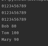 # 列表字典元祖的遍历 myList = list(range(10)) myTuple = tuple(range(10)) mySet = set(range(10)) myDict = {'Bob': '80', 'Tom': '100', 'Mary': '90'} for i in myList: print(i, end="") print() for j in myTuple: print(j, end="") print() for k in mySet: print(k, end="") print() for l in myDict.keys(): print(l, myDict[l])