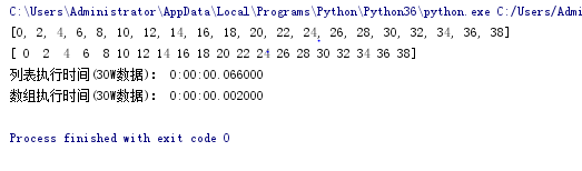 import numpy import datetime def 数列相加(n): a = list(range(n)) b = list(range(n)) c = [] for i in range(n): c.append(a[i]+b[i]) return c def 数组相加(n): a = numpy.arange(n) b = numpy.arange(n) c = a+b return c def 执行时差(): now1 = datetime.datetime.now() 数列相加(300000) now2 = datetime.datetime.now() 数组相加(300000) now3 = datetime.datetime.now() time = (now2-now1)-(now3 - now2) print("列表执行时间(30W数据):" , now2-now1,"\n数组执行时间(30W数据):" , now3-now2) if __name__ == "__main__": print(数列相加(20)) print(数组相加(20)) 执行时差()