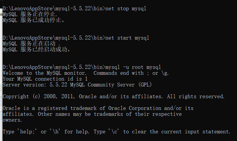 然后关闭服务,重启服务,输入mysql-u root mysql