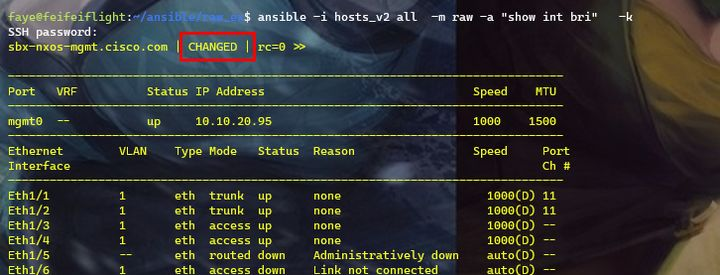 - raw相当于ssh到设备执行命令, Executes a low-down and dirty command,是比较通用低级的。不局限于Linux Windows 网络设备,只要支持ssh理论上都是可以用ansible管理的,这也是ansible被广泛使用的原因之一,覆盖范围很广,老旧通吃。