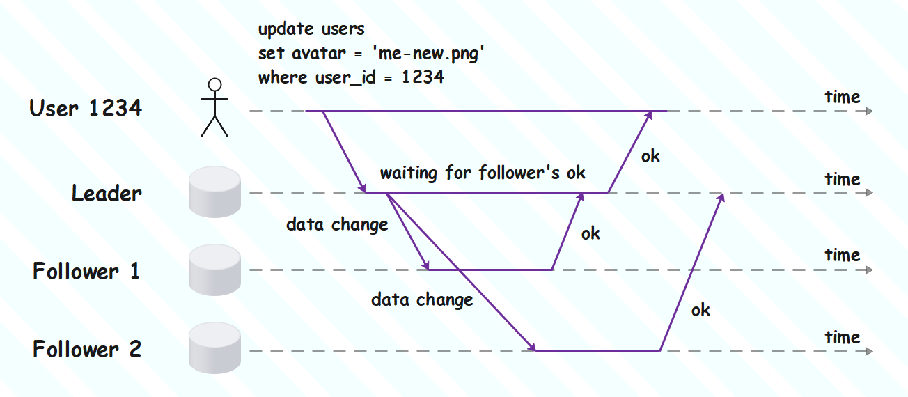 我们以 B 站更换头像为例,在某个时间点更换头像的请求会发送给领导者,领导者在收到请求之后的某个时刻又会将数据变更发送给追随者,最后领导者通知客户更新成功。我们用一张图来描述这个过程: