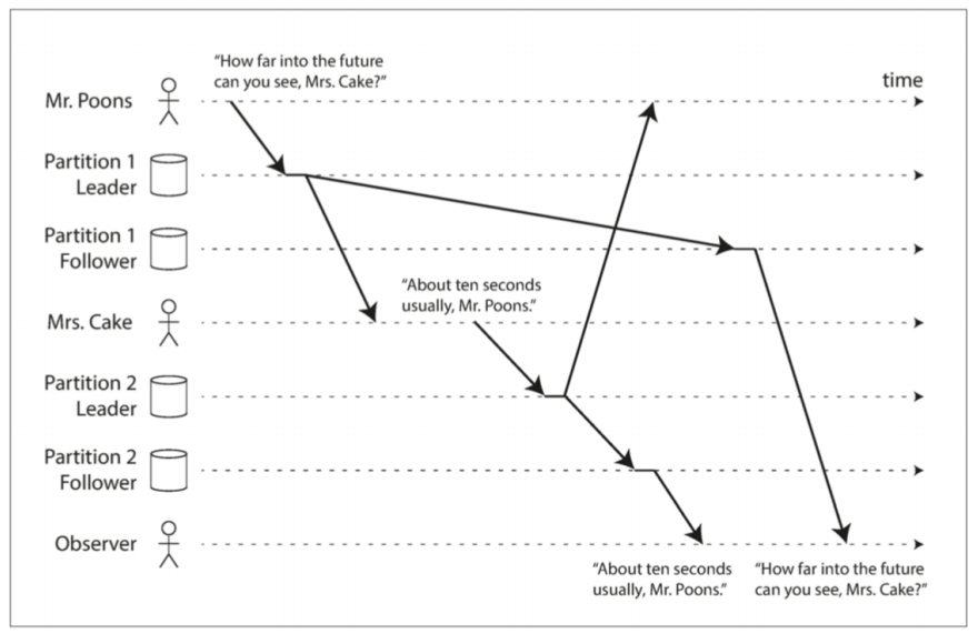这两句话之间有因果关系:Cake 夫人听到了 Poons 先生的问题并回答了这个问题。现在想象第三个人正在通过追随者来听这个对话。 Cake 夫人说的内容是从一个延迟很低的追随者读取的,但 Poons 先生所说的内容,是从高延迟的追随者读取的。 于是这个观察者会听到以下内容: