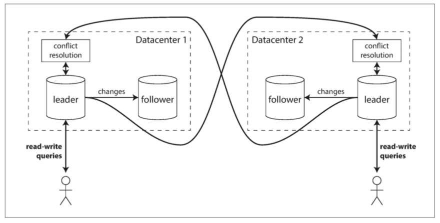 客户端发送每个写入到几个领导节点之一,其中任何一个都可以接受写入,然后接收写入的领导者将数据更改事件流发送给其它的领导者以及该领导者的所有追随者。