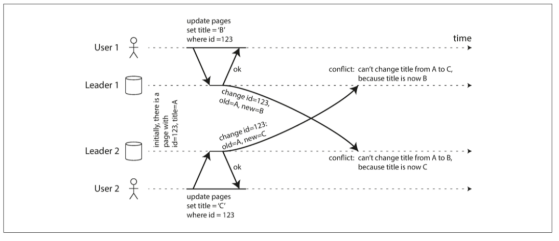 两个领导者同时更新同一记录引起了写入冲突,当然单主数据库中不会出现此问题,因为写请求是串行的。