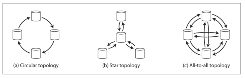 最普遍的拓扑是全部到全部,其中每个领导者将数据写入所有的其他领导者。当然也会使用更多受限制的拓扑:例如默认情况下,MySQL 仅支持环形拓扑(circular topology),其中每个节点接收来自上一个节点的写入,并将这些写入(加上自己的写入)转发给另一个节点。另一种流行的拓扑结构具有星形的形状,每个指定的根节点将数据写入转发给所有其他子节点,当然星型拓扑可以推广到树。