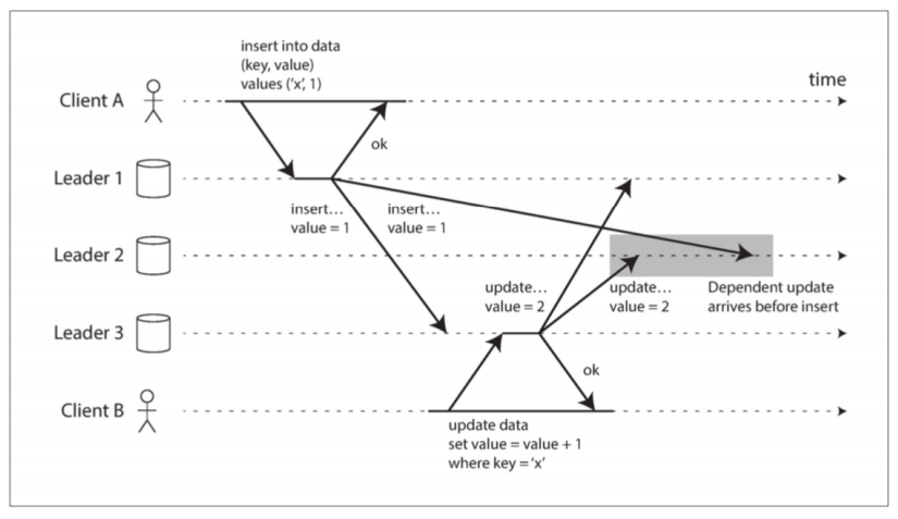 客户端 A 向 Leader 1 的表中插入一行,客户端 B 在 Leader 3 上更新该行。然而 Leader 2 能够以不同的顺序接收写入:它可以首先接收更新(从它的角度度来看,是对数据库中不存在的行进行更新),并且仅在稍后接收到相应的插入(其应该在更新之前)。