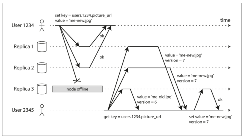 还是上面那张图,我们认为即使仅在三个副本中的两个副本上进行处理,写入仍然是成功的。如果三个副本中只有一个接受了写入,会怎样呢?