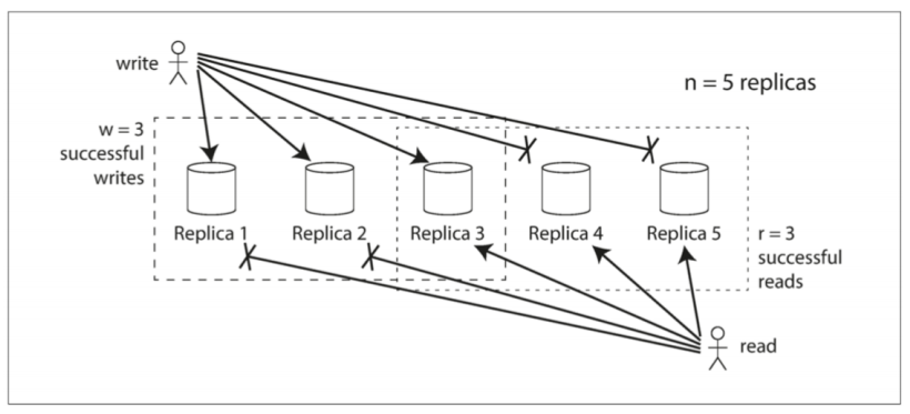 - 通常,读取和写入操作始终并行发送到所有 n 个副本,而参数 w 和 r 决定我们等待多少个节点,即在我们认为读或写成功之前,有多少个节点需要报告成功(在所有节点可用的情况下)。