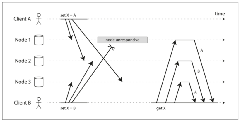 问题在于,由于可变的网络延迟和部分故障,事件可能在不同的节点以不同的顺序到达。例如,下图显示了两个客户机 A 和 B 同时写入三节点数据存储区中的键 X: