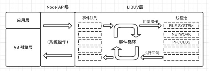 LIBUV 层:是跨平台的底层封装,实现了事件循环、文件操作等,是 Node 实现异步的核心。