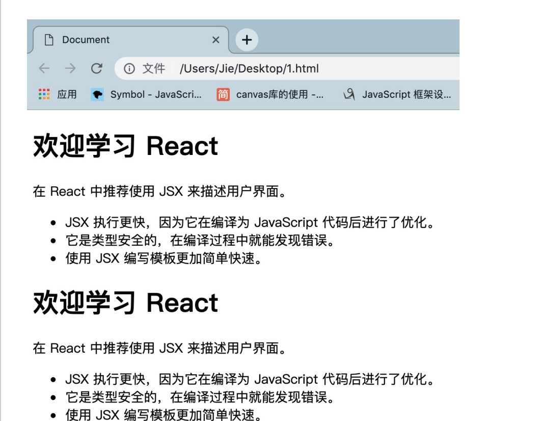<h1>欢迎学习 React</h1>