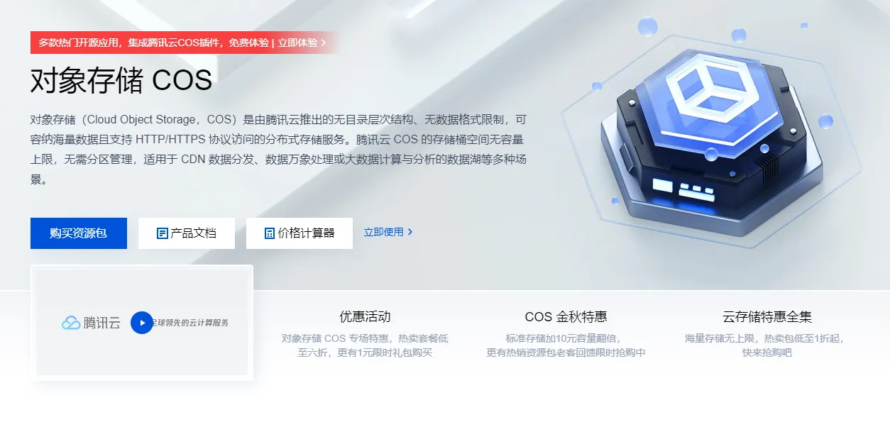 腾讯云COS是对象存储服务,使用它的原因是在折腾完各种博客之后发现gitpages的劣势就是加载图片太慢(之前使用github+j作为图床),现在正好尝试cos。新人可以一元一年,流量基本用不完。