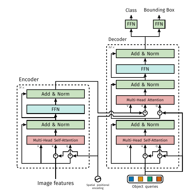 - FFNs: The FFN predicts the normalized center coordinates, height and width of the box w.r.t. the input image, and the linear layer predicts the class label using a softmax function