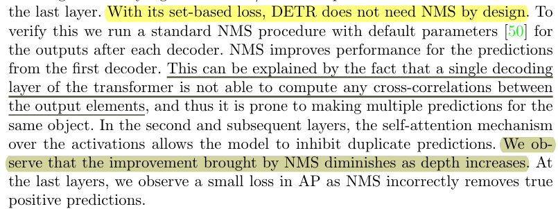 - Auxiliary decoding losses: add prediction FFNs and Hungarian loss after each decoder layer. All predictions FFNs share their parameters. We use an additional shared layer-norm to normalize the input to the prediction FFNs from different decoder layers.